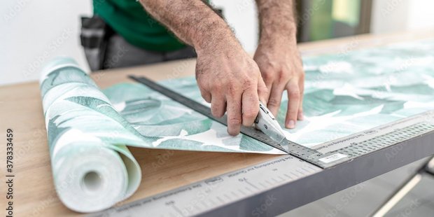 Der Tapezierer misst die Wandfläche aus und schneidet die Tapetenrollen entsprechend den erforderlichen Abmessungen zu. Dabei werden Muster und Rapport (Wiederholungsmuster) berücksichtigt, um sicherzustellen, dass die Muster oder Designs korrekt ausgerichtet sind.